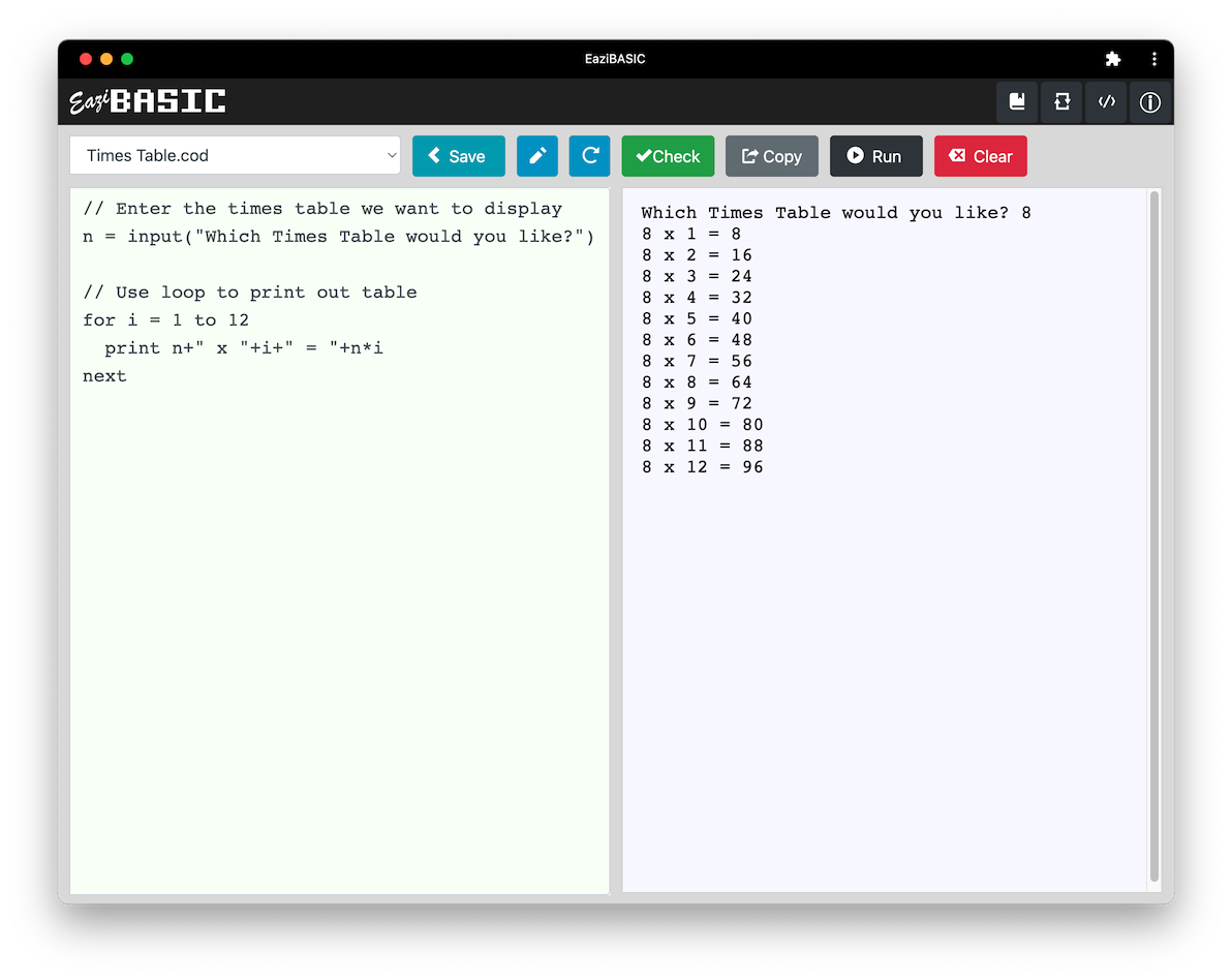 EaziBASIC is an extremely quick and easy platform for complete beginners to learn how to program - you simply type and save your own code in the left window, and run/execute it in the right window where any output will be displayed.